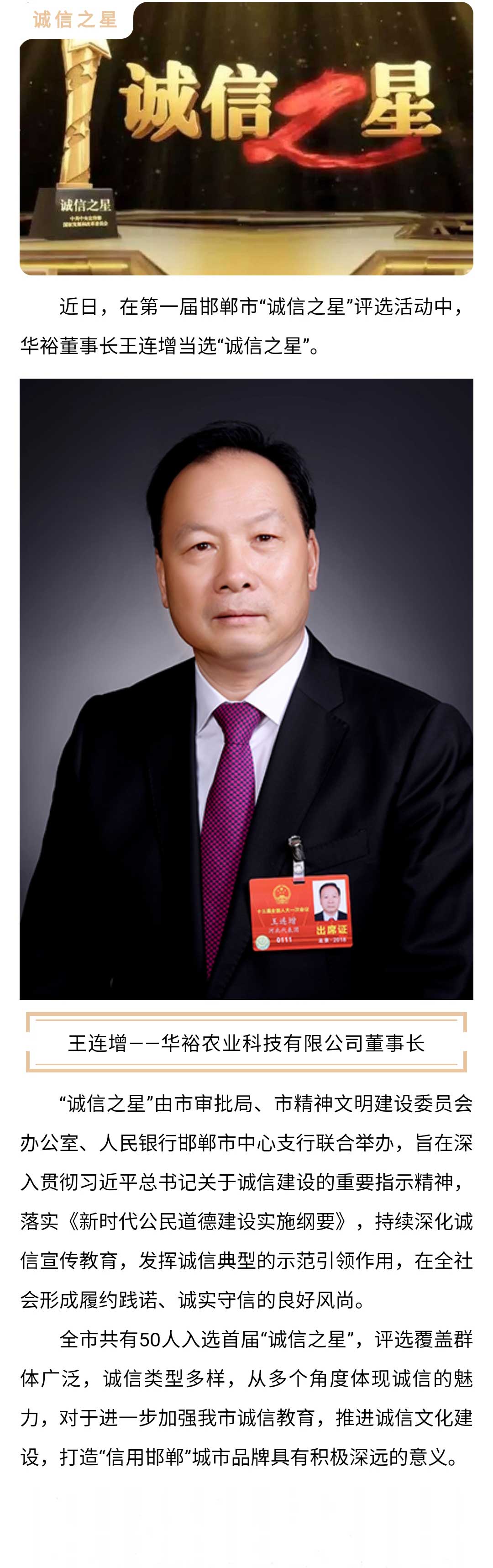 喜訊!華裕董事長王連增當選邯鄲市首屆“誠信之星”